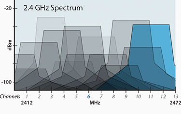 Embora, teoricamente, os canais 1, 6 e 11 da banda de operação de 2,4 GHz não devem sobrepor-se, na prática, há interferência entre canais que afeta o desempenho do receptor, especialmente em ambientes ruidosos, de alta densidade. Por exemplo, um AP típico operando no canal 6 também ouve RF dos canais 1 e 11, porque o AP típico tem um filtro genérico que apenas filtra qualquer interferência que não seja 2,4 GHz.